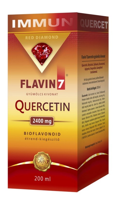 Quercetin: A kvercetin egy flavonoid, mely gyümölcsökben és zöldségekben található meg.Jól ismert antioxidáns aktivitásáról és allergiaellenes tulajdonságáról, amelyeket az immunrendszer stimulálása, a vírusellenes aktivitás, a hisztamin felszabadulásának gátlása, a gyulladást elősegítő folyamatok gátlása jellemez.Hatásmechanizmusa:-a vírus sejtfertőző képességének gátlása-a már fertőzött sejtek replikációjának gátlása-a fertőzött sejtek antivirális gyógyszeres kezeléssel szembeni rezisztenciájának csökkentéseHatóanyagok: 120 mg Quercetin+480 mg Bioflavonoid/10 mlÖsszesen: 2400 mg Quercetin+9600 mg Bioflavonoid 200 ml-ben