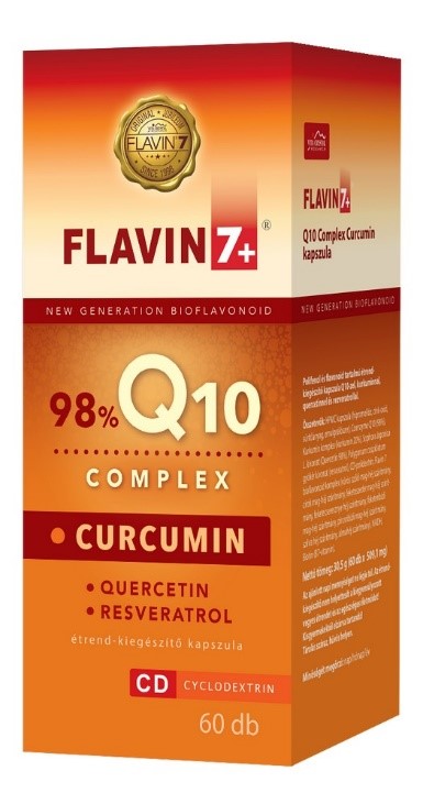 Összetevők: CoenzymeQ10 (98%), kurkumin, CD-polidextrin, Flavin7 bioflavonoid komplex (vörös szőlő mag-héj szárítmány, cirok mag-héj szárítány, feketeszeder mag-héj szárítmány, feketecseresznye héj szárítmány, feketeribizli mag-héj szárítmány, pirosribizli mag-héj szárítmány, szilva-héj szárítmány, almahéj szárítmány), zselatin kapszula.